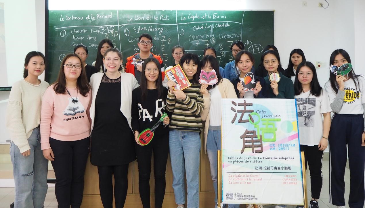3月26日下午两点,西语系法语专业的同学们在法国外教Anne-Flore老师的带领下,开展了趣味横生的法语角活动。在活动中,同学们不仅深入了解了法国作家Jean de La Fontaine以及他的作品,更是在Anne-Flore老师的指导下亲身演绎了《乌鸦和狐狸》、《狮子和老鼠》、《蚂蚁和蝉》这三个寓言故事。本次活动寓教于乐、妙趣横生,让同学们在欢声笑语中增长了见识,体会到了学习法语的乐趣。