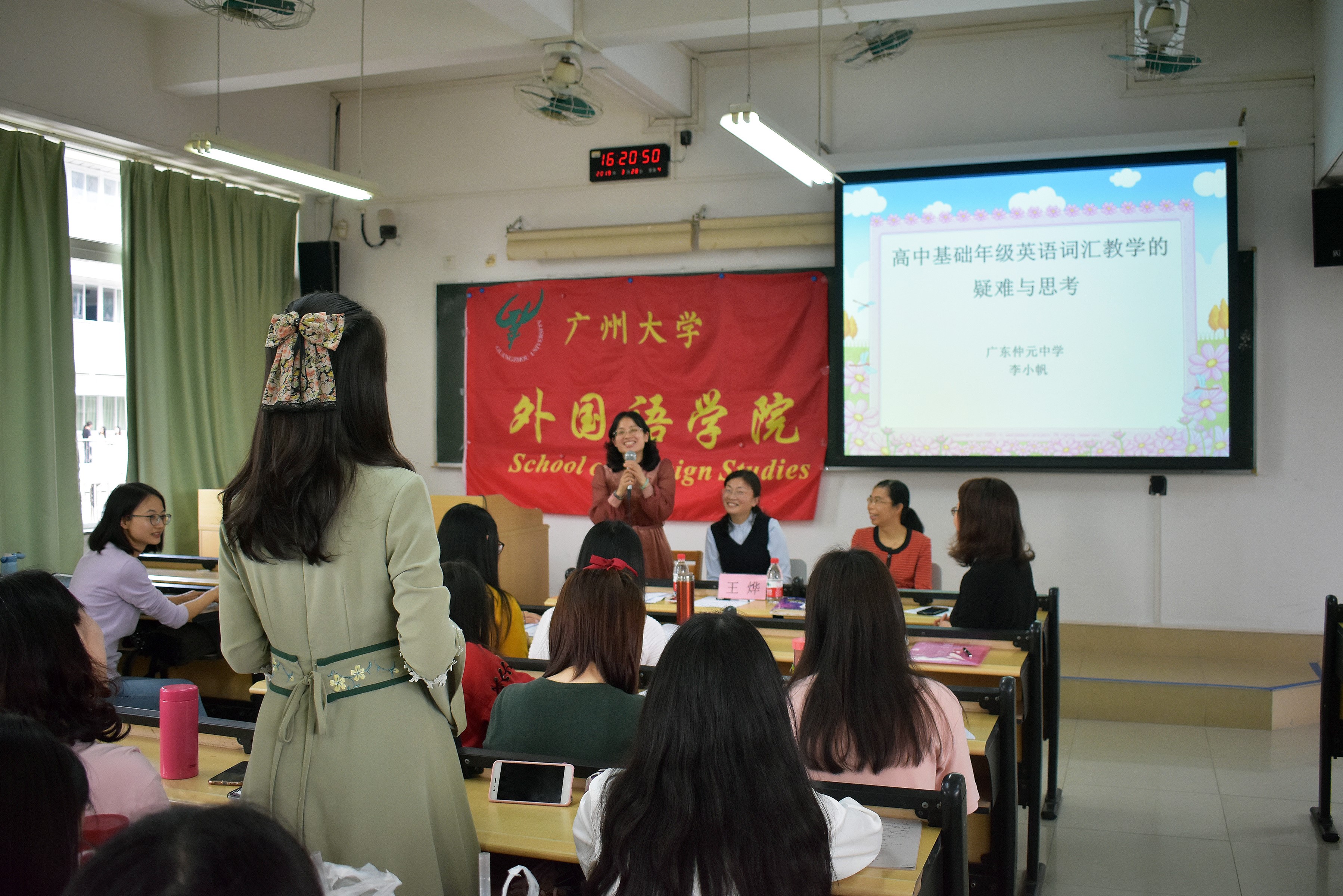 首先,是两场讲座。名教师培养对象--广州市番禺区仲元中学英语科组长李小帆老师的题目是“高中基础年级英语词汇教学的疑难与思考”,她强调了词汇教学的重要性,引导同学深入思考词汇教学的11个疑惑,并展示了形式多样的词汇教学方式。