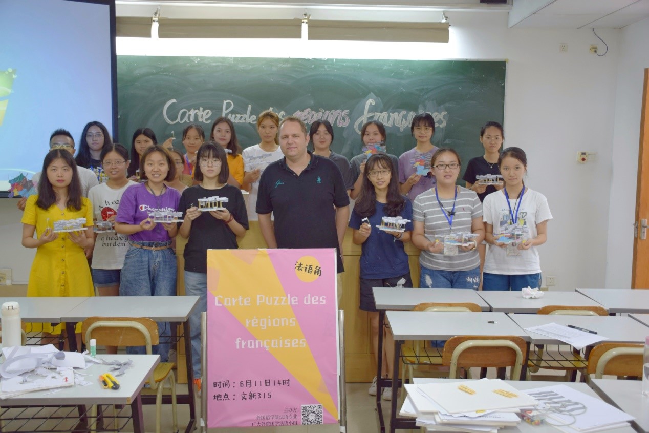 6月11日下午,我院西语系本学期第三次法语角活动在文新315如期举行。活动在外籍教师Sébastien Damry的耐心指导下顺利展开,法语专业同学积极参与,学习热情高涨。借助拼图等一系列有趣的活动,在轻松愉快的氛围中Sébastien Damry老师带领同学们了解法国的一些政区知识和美食文化。此次活动寓教于乐,不仅使同学们增进了对法国文化的了解,并且进一步培养了同学们法语学习的兴趣。