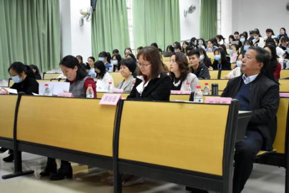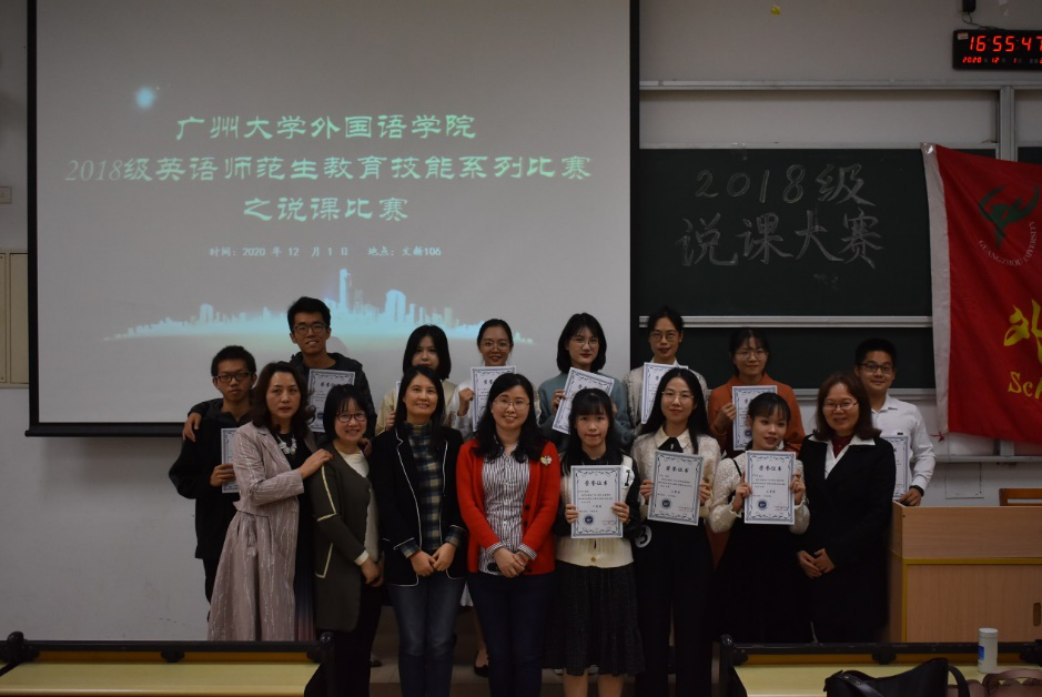 的肖坤学院长、苏远连副院长、我院省级教师教育示范基地--广州市番禺区大龙中学麦焕炎老师和广东省实验中学越秀学校李小华老师以及英语师范教研室全体教师。18级全体师范生和19级师范生代表观摩了本次比赛。