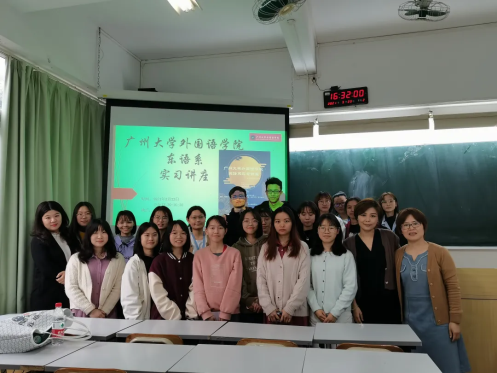 接着,两个公司的代表分别进行了行业现状讲座。第一位主讲人是来自广州市泰领翻译服务有限公司的任升浩老师。在程果总经理介绍完公司的相关业务后,任老师介绍了作为职业翻译的相关情况,日语法律翻译的需求与现状以及公检法中的法律翻译。并通过具体的案例分享,让学生更加深入地了解日语法律翻译的工作。