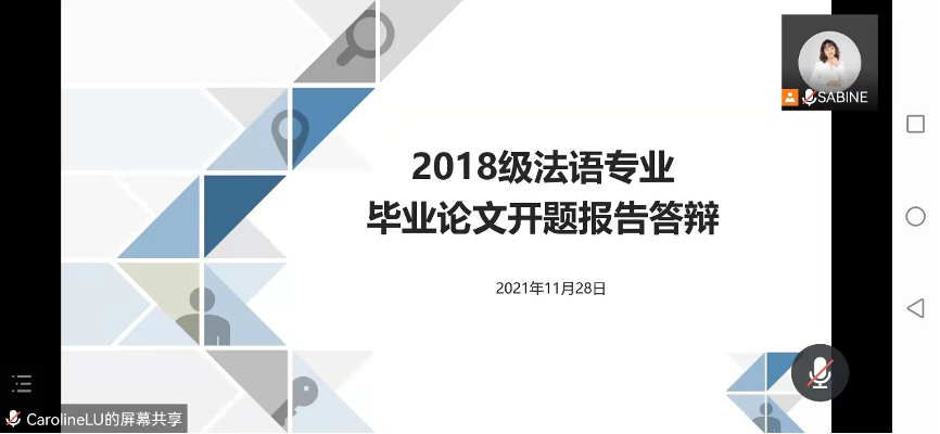 2021年11月28日,法语专业2022届本科生毕业论文线上开题答辩在腾讯会议(会议号:286700712)顺利完成。此次答辩会由西语系主任邹琰副教授主持,答辩专家包括Frédéric Girani、Sébastien Damry和Anne-Flore Vrac、陈潇、冯雪飞、李悦和卢秋燕老师。