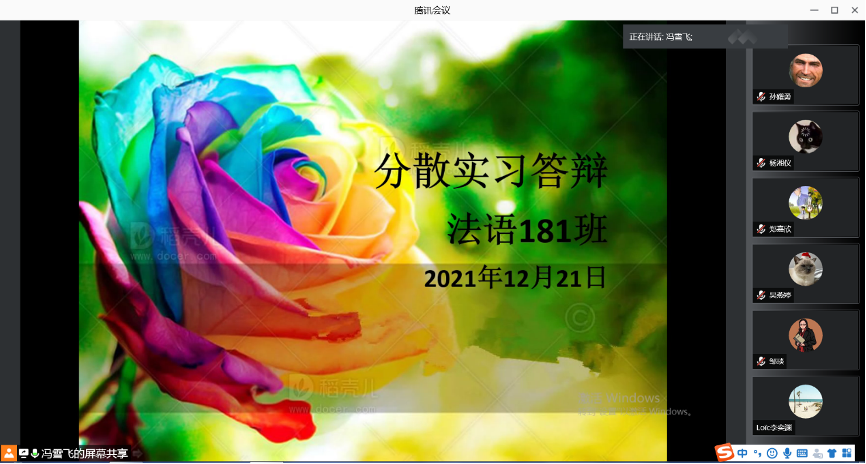 12月21日,星期二下午,法语181班同学利用腾讯会议平台进行了分散实习答辩会,系主任邹琰老师、系副主任陈潇老师及卢秋燕、李悦、冯雪飞老师参加了此次答辩并担任答辩评委。
