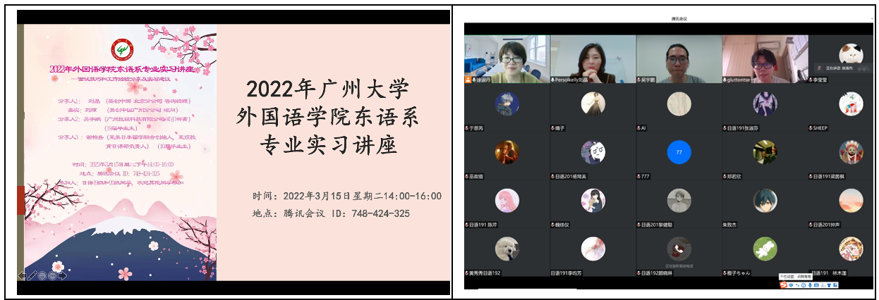 讲座邀请了四位主讲嘉宾。第一位嘉宾是英创中国北京分公司咨询经理刘晶女士。刘晶经理为同学们介绍了日企、欧美企业、民营企业的西瓜视频的异同,分析了当前市场对于日语专业同学的需求,提醒同学们在就业时应注意分析行业前景再选择行业赛道。第二位嘉宾是英创中国广州分公司顾问刘琼女士。刘琼顾问为同学们详细介绍了面试时的基本礼仪,以及面试时的常见问题,建议同学们应先认识自我再进行职业选择。第三位嘉宾是19届毕业生吴宇鹏,现就职于广州巨核科技有限公司(moji辞書)。吴宇鹏前辈分享了他的大学经历及实习工作经验,鼓励同学们积极参加实习,将专业知识理论与社会工作实践相结合,为毕业后就业打下基础。第四位嘉宾是10届毕业生谢柏盛,现任“至顶教育”日语部负责人,“至美日本留学”机构的联合创始人。谢柏盛前辈为同学们分析了毕业后的就业方向,重点介绍了日语教师现状,以及成为一名日语教育工作者需要做出的努力等同学们关心的话题。