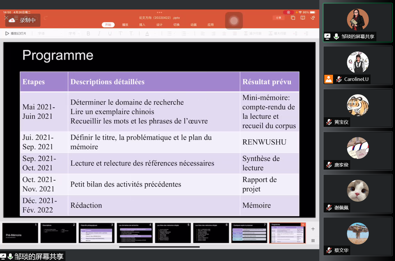 2022年4月26日下午2点我院法语专业在腾讯会议平台(会议号:219-953-380)举办19级毕业论文动员大会暨导师见面会。导师们依次向学生介绍自己的研究领域、研究方向、论文写作要求等。邹琰主任简要介绍了接下来的论文工作布局,向同学们提出如下要求:要把学术论文撰写当成一个提升自己的平台,做到理论与实践相结合。