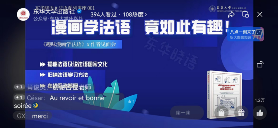 3月11日晚七点,在东华大学出版社的微信公众号平台上,三位教师针对这本教材做了首场直播活动。在活动中,老师们介绍了該教材的编撰特色、理念及适用人群,还详细描绘了每一章的语法能力和交际能力。在互动回答环节,老师们分享了编撰过程中的趣事及插图的特色。参加直播的观众有本专业学生,也有社会法语爱好者,大家针对法语学习上的困难提出了疑问,老师们给予了详细解答,例如:如何区分近义词,如何深入阅读等。