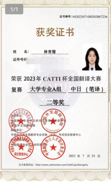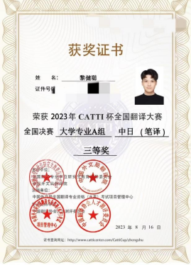 近日,2023年“CATTI杯”全国翻译大赛决赛结果揭晓。我院东语系2020级学生黎健聪荣获笔译组三等奖,魏育芳老师获优秀指导教师奖。另外,在此前举行的全国复赛中,2020级学生林育珊、黎健聪荣获笔译组二等奖。本次比赛东语系积极动员,多位同学参赛,并创下佳绩,是东语系“以赛促教、以赛促学、以赛促改、以赛促建”教学模式的又一成功实践。