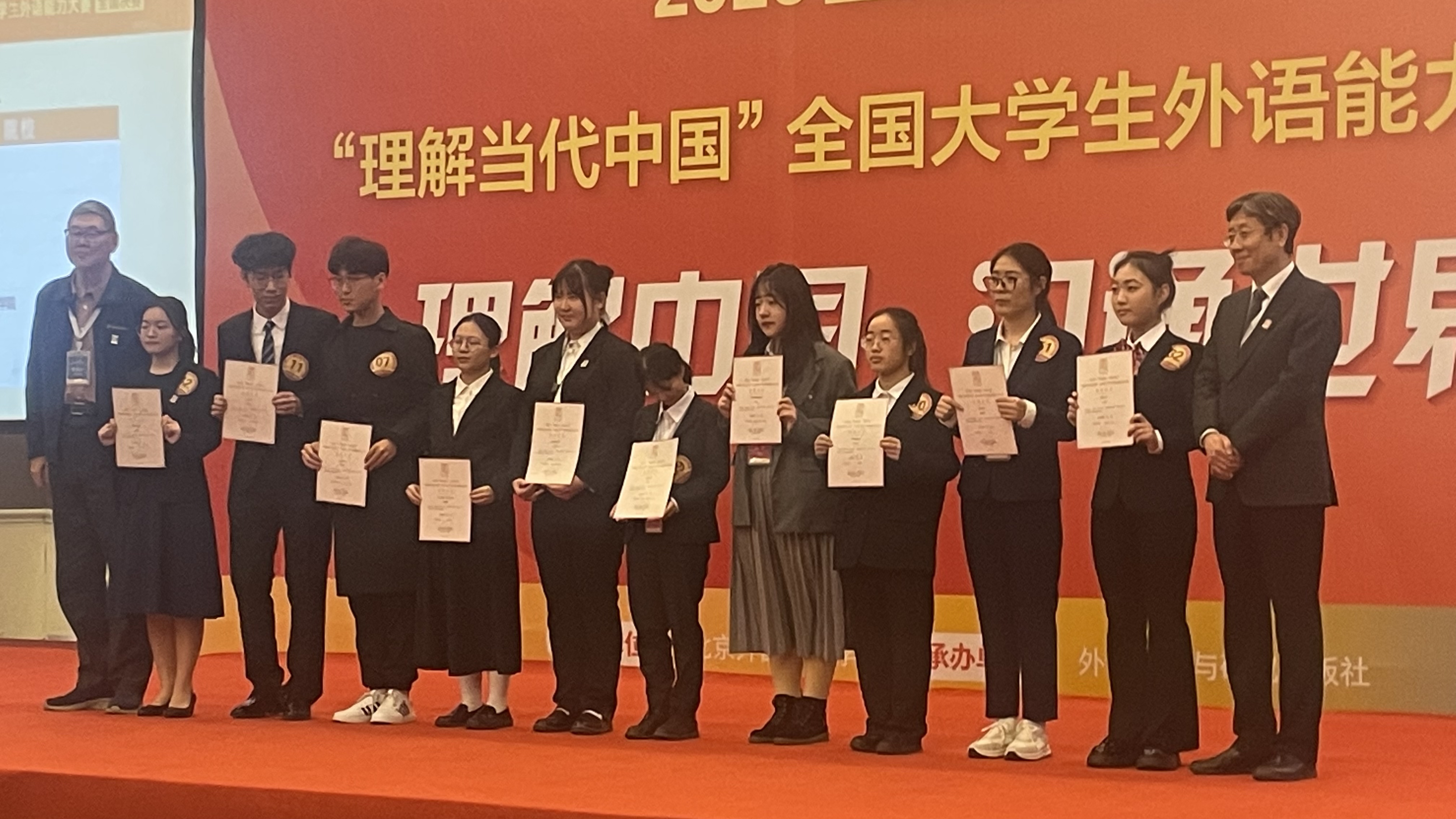 2021级英语(师范)专业的肖琦获得阅读比赛国家银奖,2021级英语专业的资钧廷获得口译比赛国家银奖,2021级日语专业的林家和获得日语综合赛国家银奖;2021级英语(师范)专业的王宇成、2021级英语专业的资钧廷获得写作比赛国家铜奖;2020级日语专业的梁芷欣获得日语综合赛国家铜奖。此前,我校代表队在2023年“外研社·国才杯”“理解当代中国”全国大学生外语能力大赛广东省省赛英语类五项赛事(写作、阅读、演讲、口译、笔译)中,共获得金银铜奖16项,位列全省第一,其中金牌数位列全省第四;在广东省省赛多语种日语组、法语组赛事中,共获得金奖2项、银奖1项。