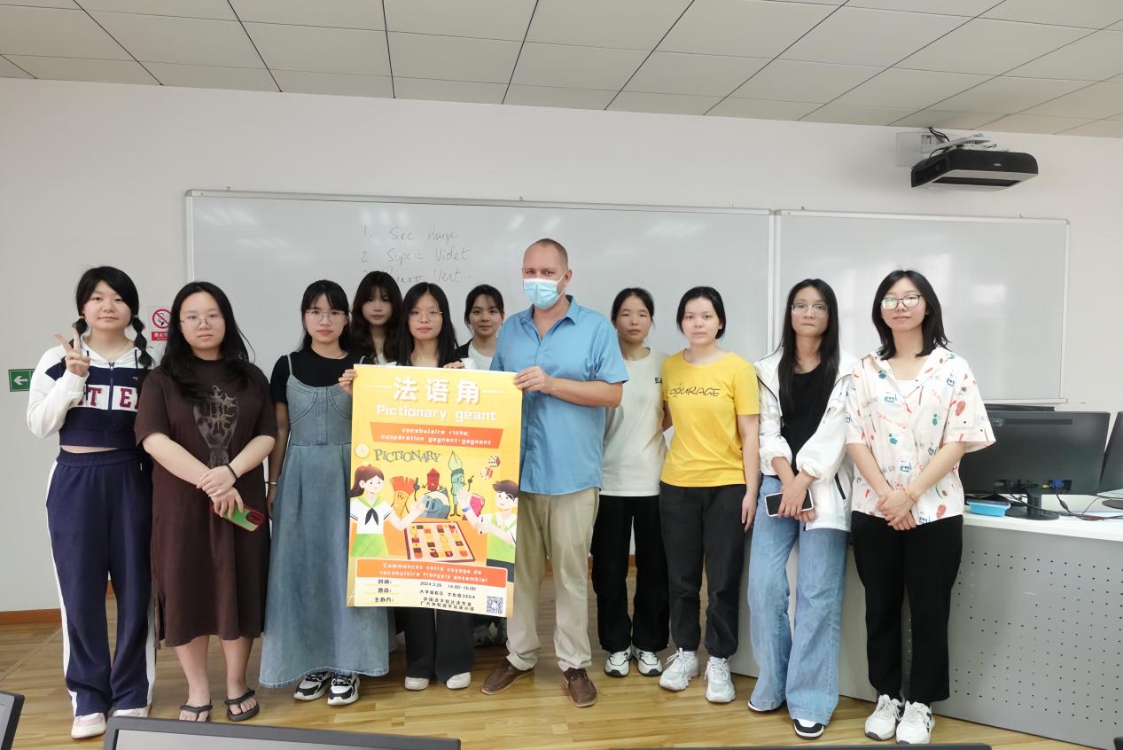 3月26日下午两点,我院法语专业在大学城校区文俊西A306成功举办了法语角活动“巨型词典”。本次法语角由外教Sébastien Damry老师主持,参与人员为法语专业23级和22级部分学生。活动伊始,Sébastien Damry老师详细讲解了“巨型词典”的游戏规则,学生们知悉游戏规则后,分小组展开了游戏。最终第一组同学取得胜利。 通过本次活动,学生不仅丰富了词汇量,还增强了团结精神和团队协调能力。