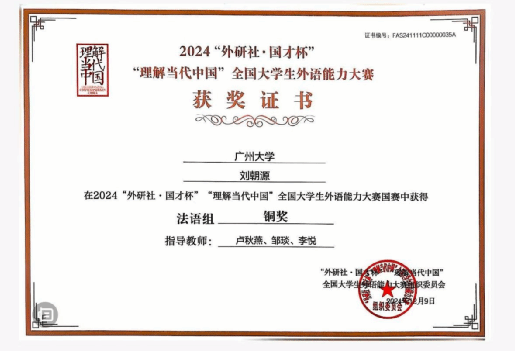 此次获奖不仅是对刘朝源同学个人努力的肯定,也是对我院法语专业教学成果的认可。法语专业将继续致力于提升外语教学质量,培养学生的国际视野和跨文化交流能力,为培养更多高素质外语人才而努力。