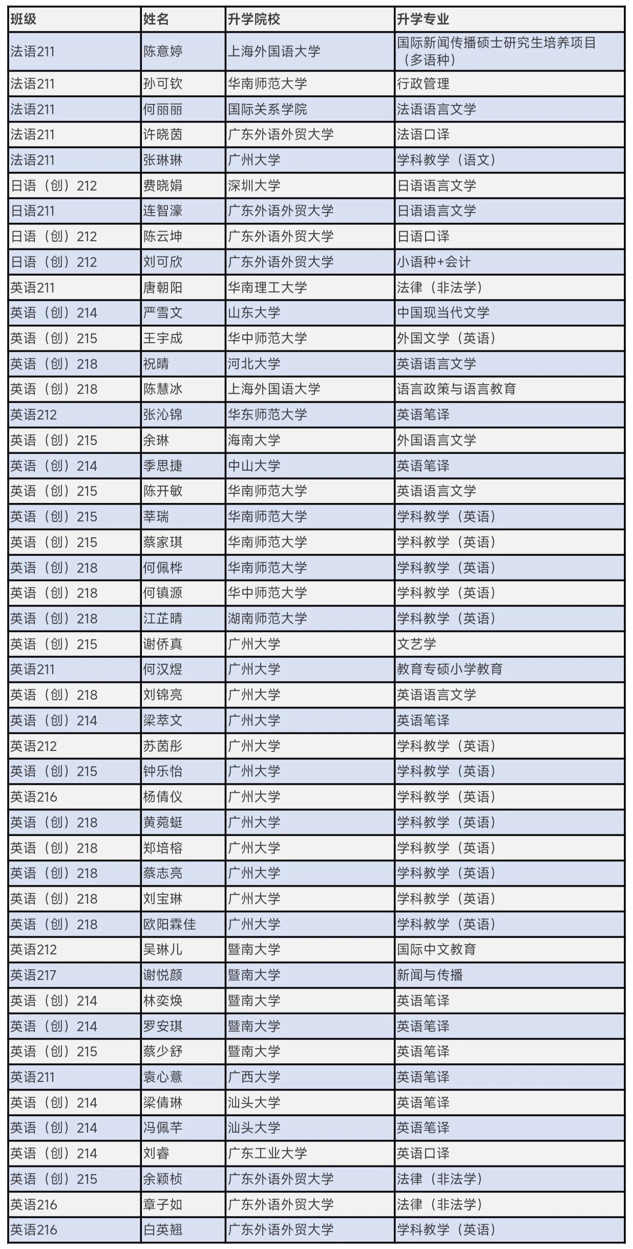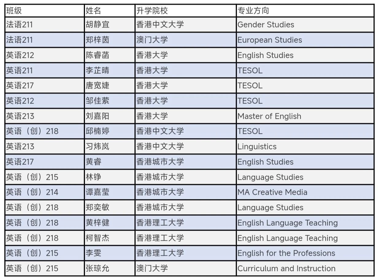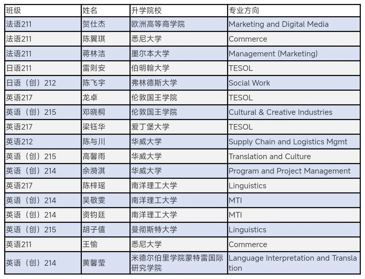 境内升学方面,学生主要升学院校为广东外语外贸大学、华南师范大学、暨南大学等知名高校,其中学科教学(英语)专业最受青睐,跨专业选择如法律(非法学)、英语笔译等也表现突出。
