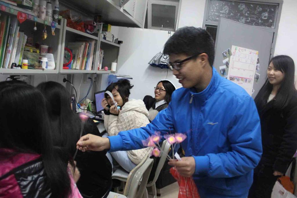 3月10日晚,由我院女生部与计算机学院精心策划的女生节特别节目“浪漫之夜”在女生宿舍B16拉开了帷幕。男生分头将事先准备好的一束束鲜花和棉花糖亲手送到女生手上。随后,男生们高举手机,明亮灯光列成心形,一句“we wish you a happy girl’s day” 如雷贯耳。下一秒,吉他声缓缓响起,歌声传去浓浓情意。