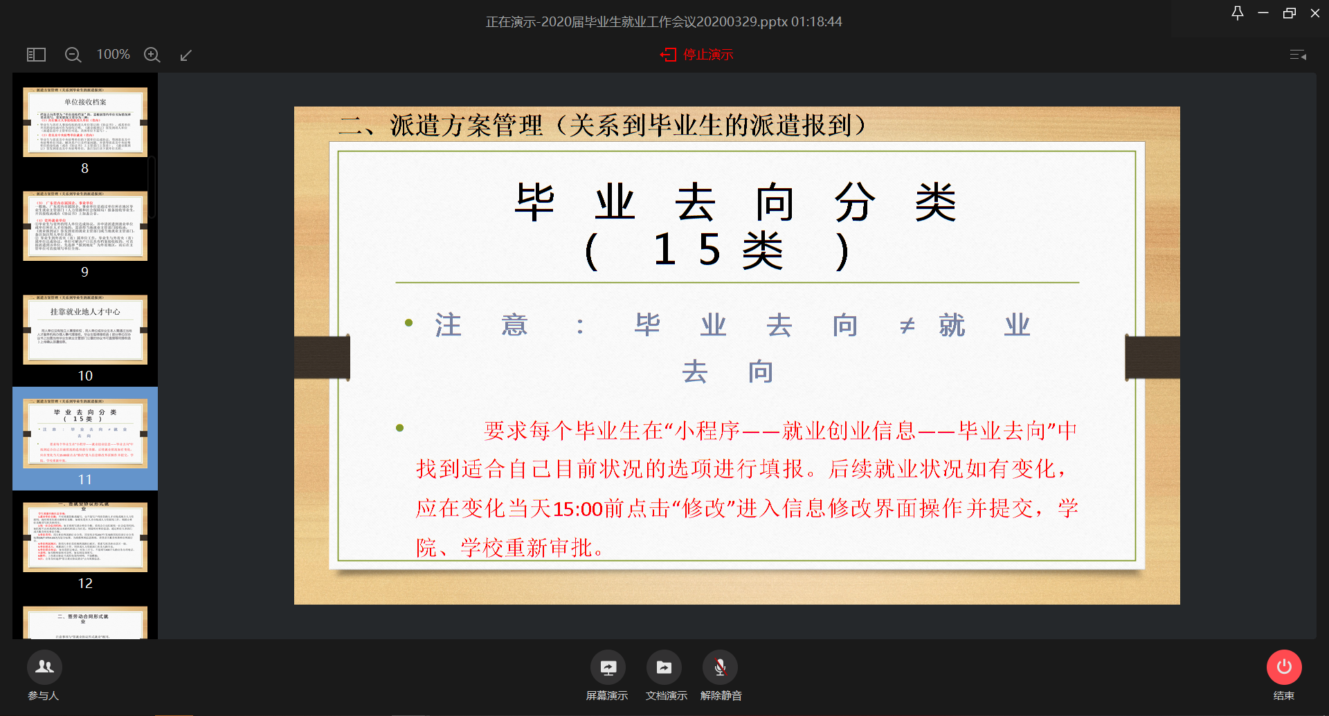 随后,徐慧老师对就业系统中同学们比较关心的几个问题进行了答疑解惑。同时给大家布置了毕业生就业去向填报工作,并对15种毕业去向类型进行解释,方便同学们理解与选择。最后,徐老师分享了多种就业渠道,希望同学们积极关注各种就业平台,思想上重视,并积极行动。