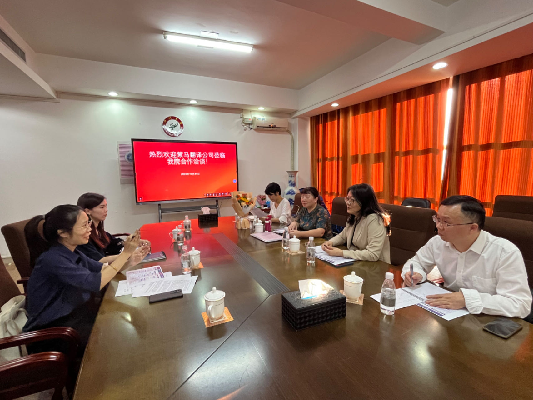 汪东萍教授代表学院致欢迎辞,欢迎策马翻译公司来校洽谈校企合作事宜。策马翻译公司代表向与会人员介绍了公司发展情况和校企合作案例,内容包括学生实习实践、毕业生就业、专业赛事的举办、人才培养等多个方面。双方就校企双导师助力人才培养、为学生提供翻译实践机会、校企协同助力科研发展等方面展开了深度沟通。