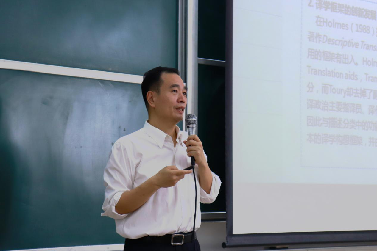 讲座伊始,莫爱屏教授介绍本次讲座由五个部分组成:译学构想框架及应用、翻译学论文数据分析、翻译成果产出路径、翻译学论文写作规范和总结部分。随后,莫教授紧紧围绕着这五个部分,向同学们分享如何写出高质量的学术论文。