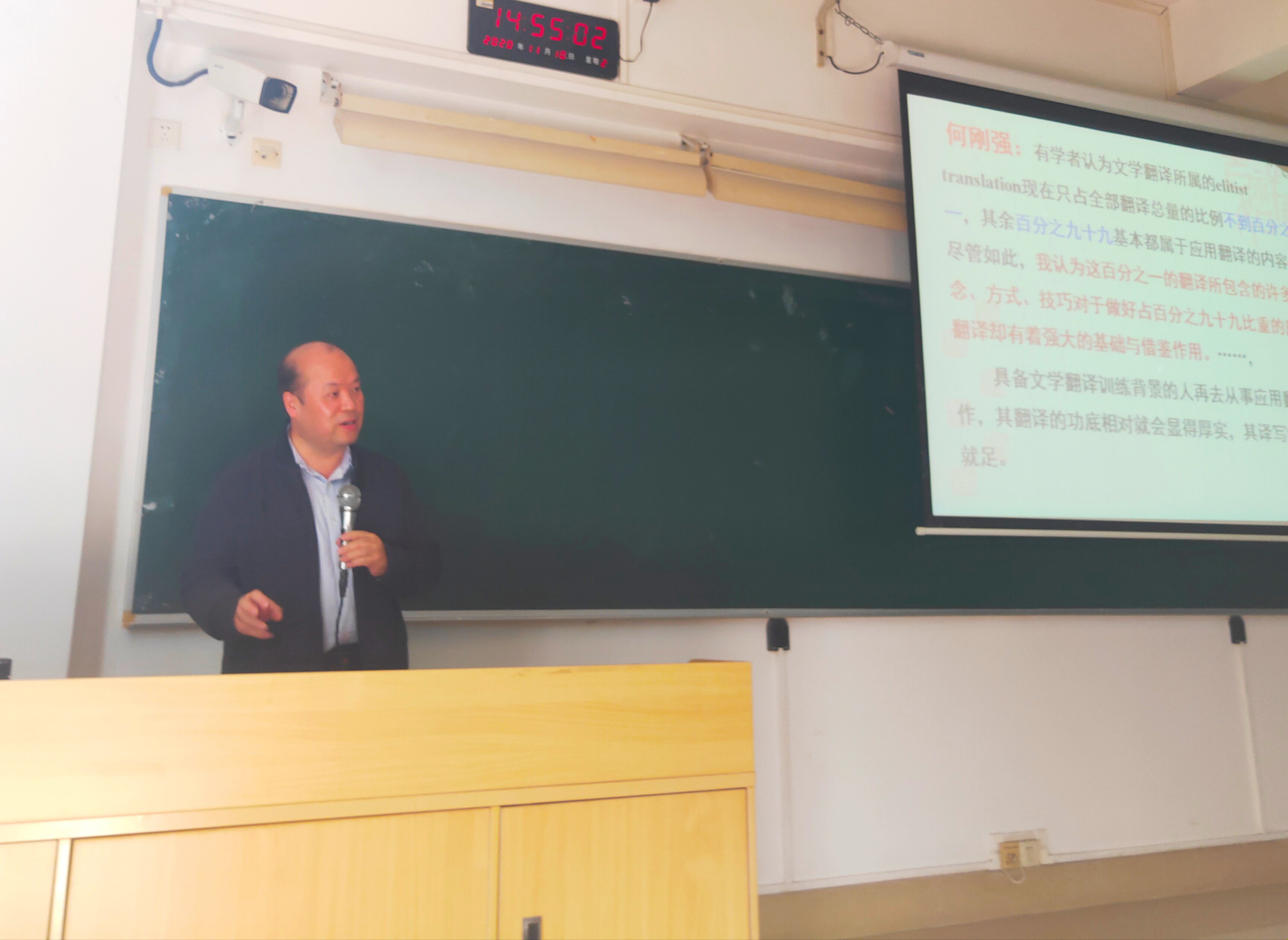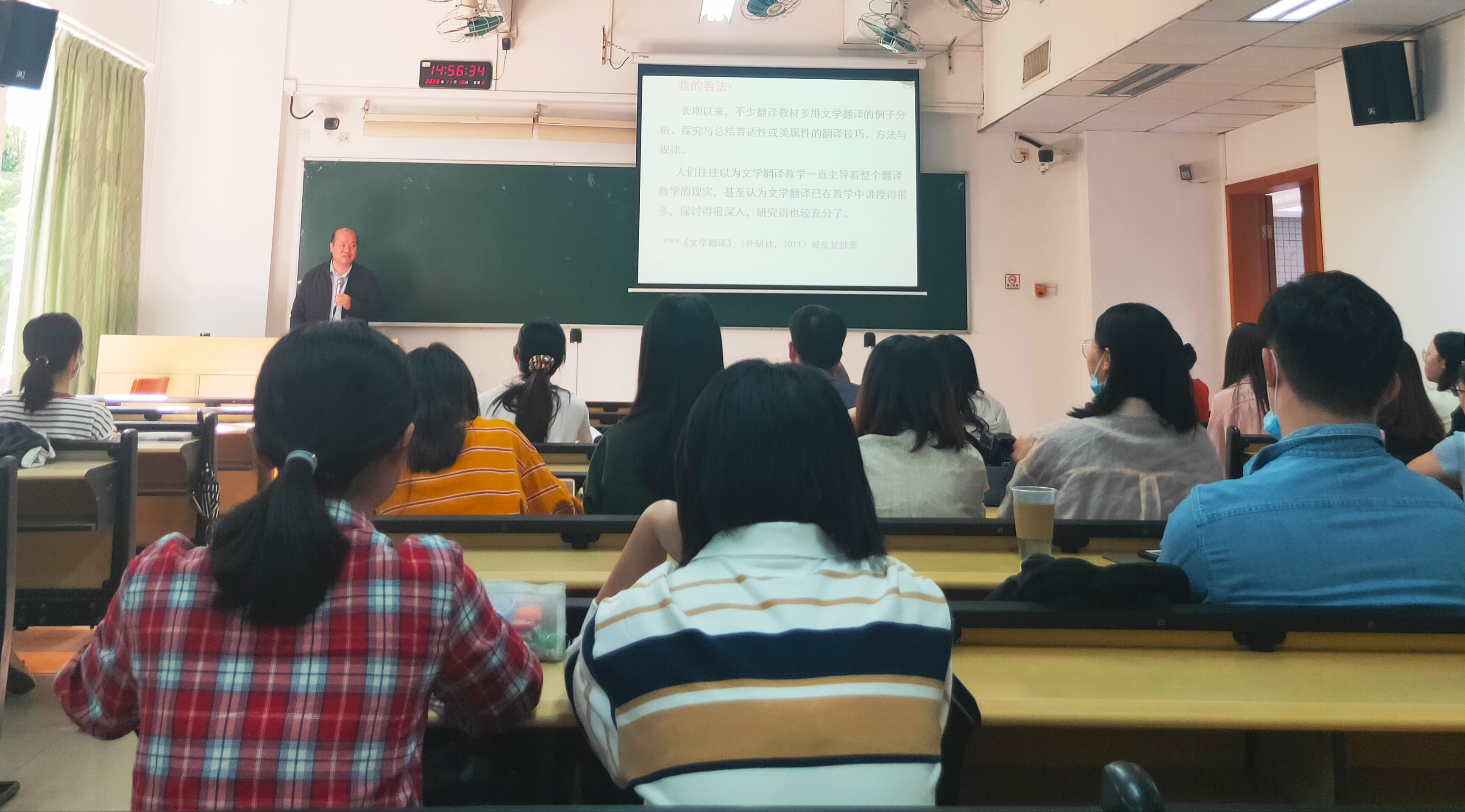 随后,张教授与在座师生探讨了文学翻译学是什么的问题。张教授解释道,文学翻译含有审美的成分或元素,学习目的在于提升在语言、文学、艺术等方面的审美修养,逐步提高翻译能力与水平。张教授在阐述的同时,还与大家探讨了几个英译汉的例子,现场气氛十分活跃。