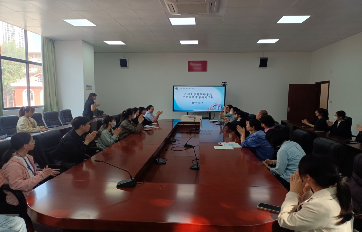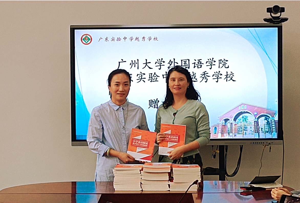 本科生实践基地和专业学位点实习实践基地,2019年获批为我院的广东省示范性教师教育实践基地。至今,我院与省实越秀中学已有二十多年的合作历史。省实越秀中学作为我院英语专业师范生的见习、实习和研习的一个高质量平台,在持续为我院英语师范生提供教育实践机会的同时,还和我们共同举办了众多教师培训项目、学术讲座、研讨会等教研活动。在赠书仪式上,陈姝主任衷心感谢省实越秀中学多年来对我院英语专业师范生培养工作的支持,陆春俏主任则表达了进一步加强合作的愿望,她指出,希望在和我院的共建共赢中继续做好教师发展工作。