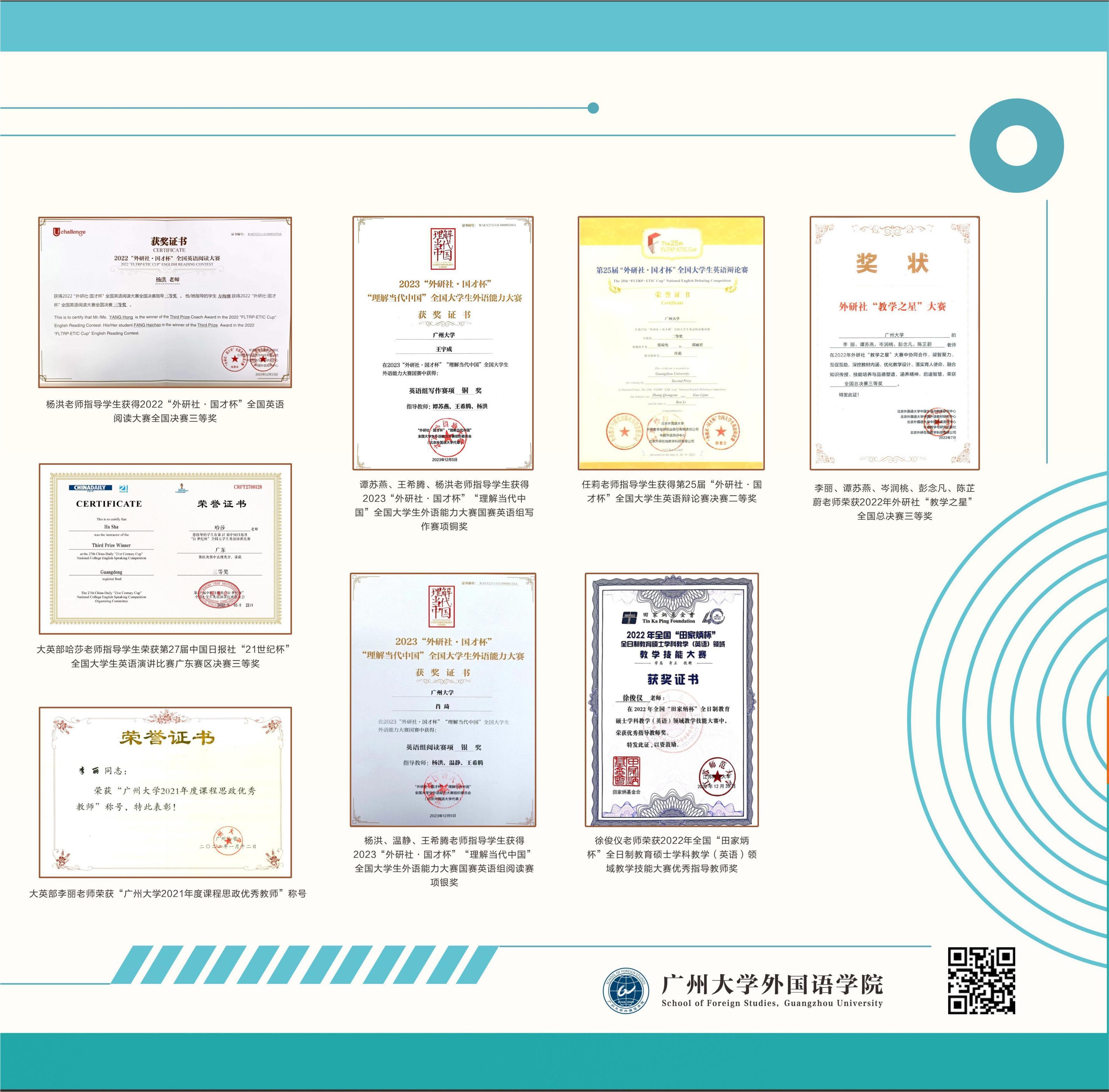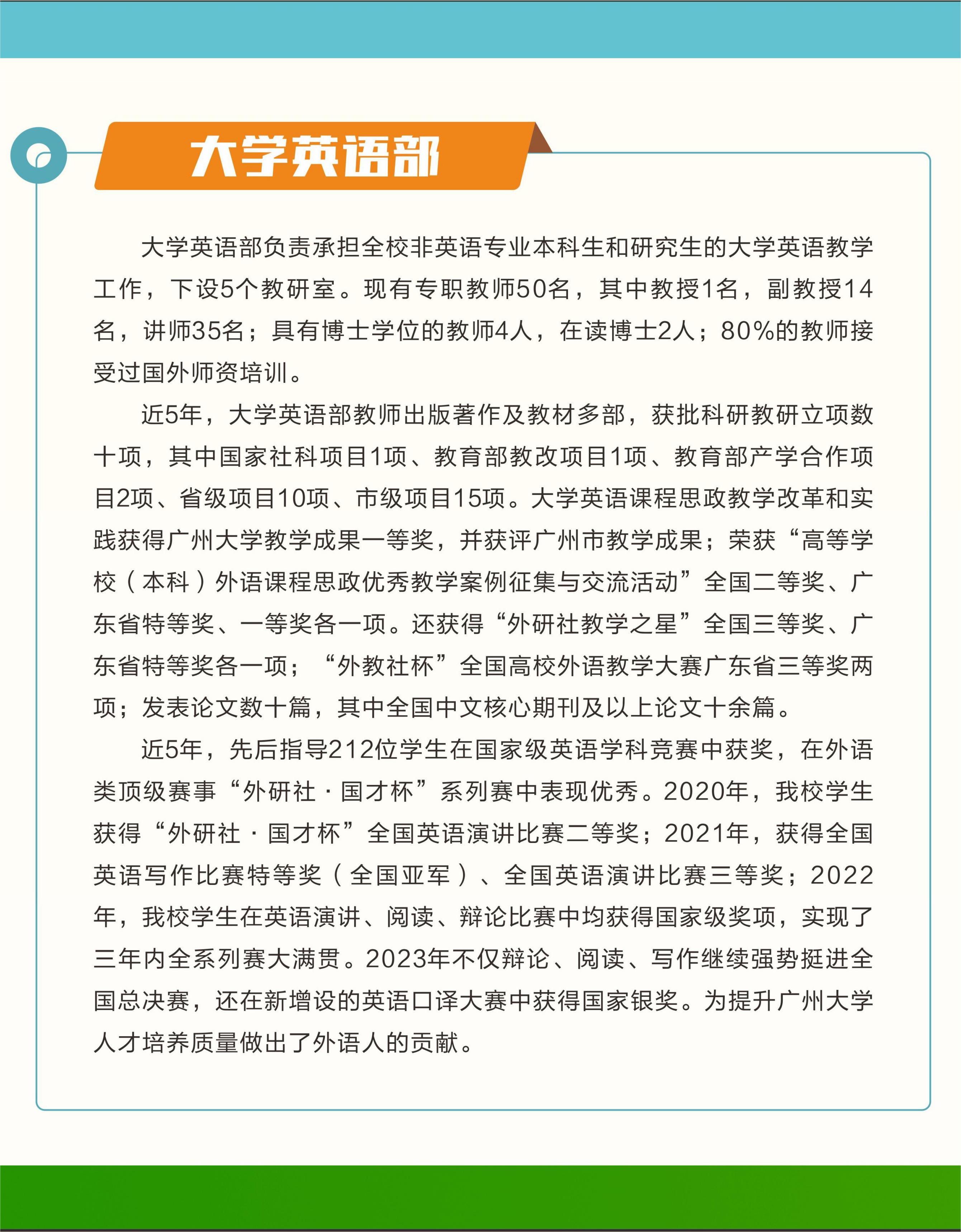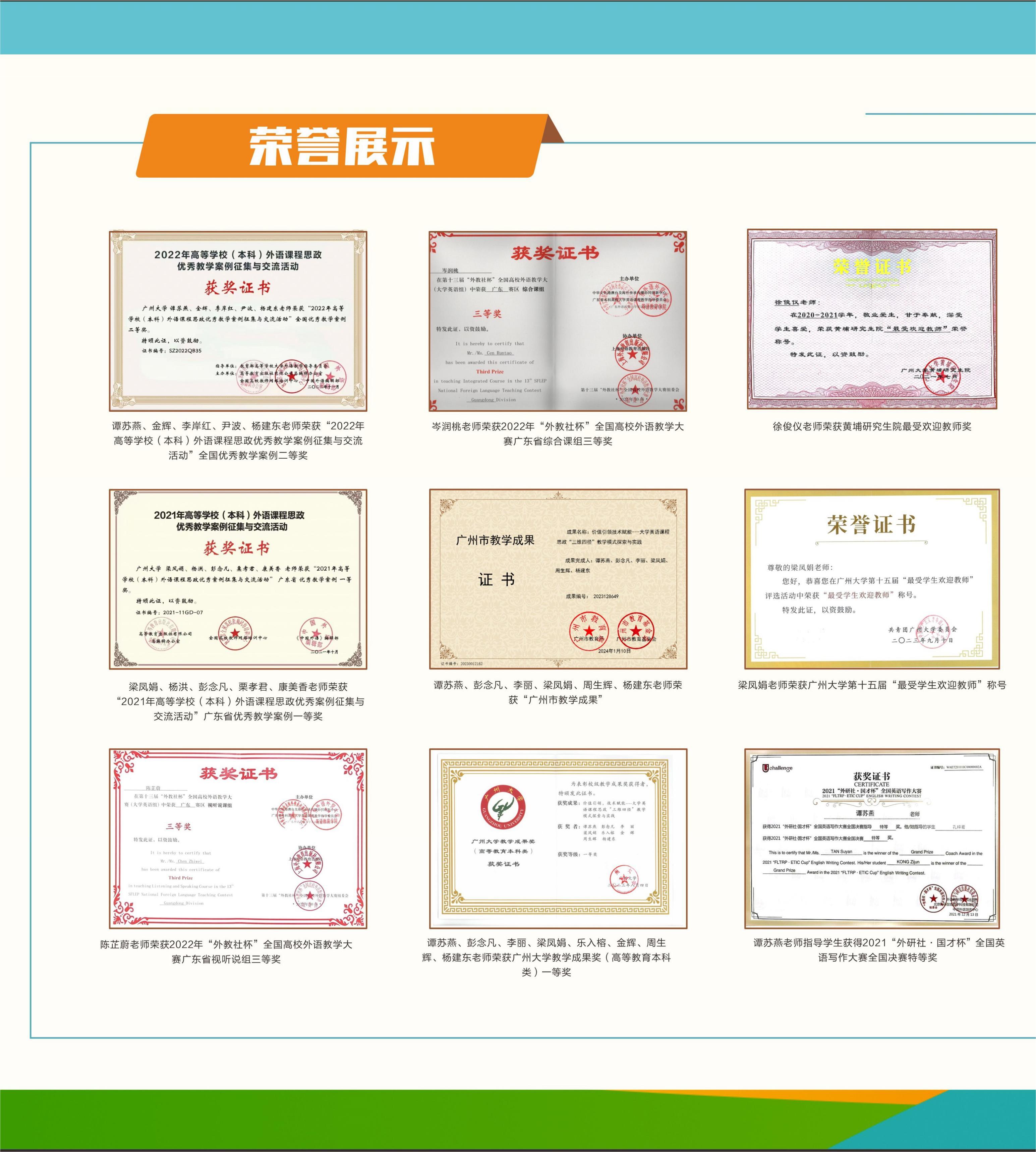 大学英语部始终把教学摆在首位,不断在课程思政、信息技术赋能教学等方面推进教学改革,极大提高了学生的英语综合运用能力,并且充分整合人才资源,形成了一个老中青传帮带、职称学历结构越来越合理的良好局面,在教学、科研等方面不断取得新成绩。近些年先后被评为全国首批(31所)大学英语教学改革示范点院校、荣获广州市教育工会“巾帼文明岗”及广州市“三八红旗集体”称号。先后有教师团队荣获广东省高等教育省级教学成果一等奖1次、广州市教学成果1次、西瓜视频 教学成果一等奖3次和西瓜视频 教学成果二等奖1次。
